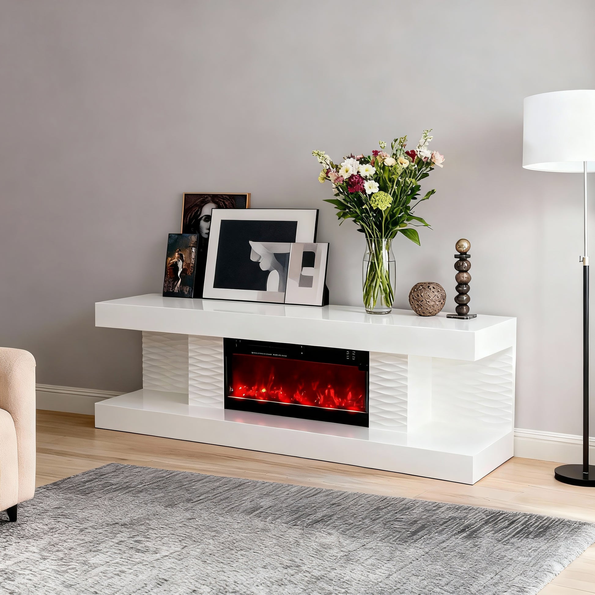 Meuble tv Cheminee blanc avec flammes led et chauffage intégré